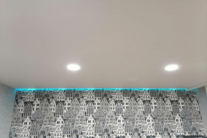 • Тканевый белый потолок будет максимально матовым, визуально отличить его гипсокартонных плит не представляется возможным. Идеально ровная поверхность, которая не бликует и не отсвечивает.