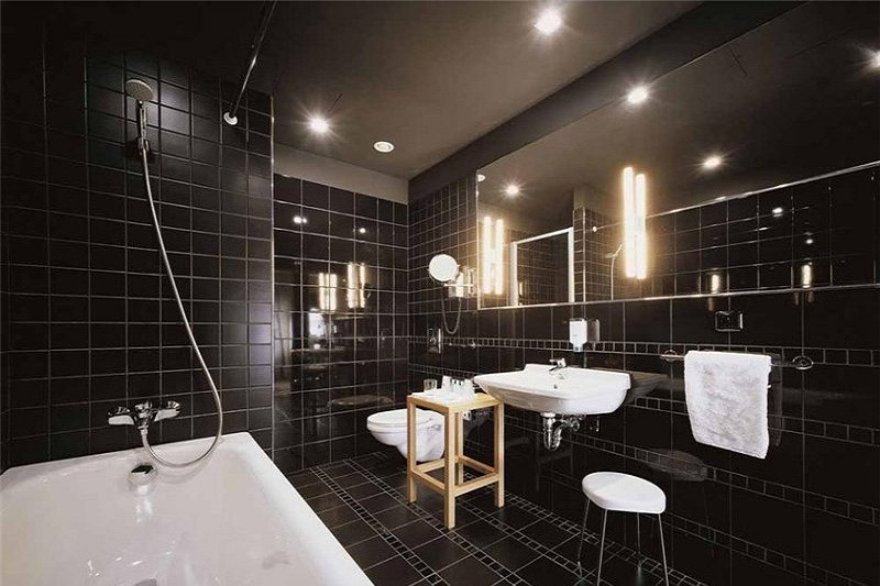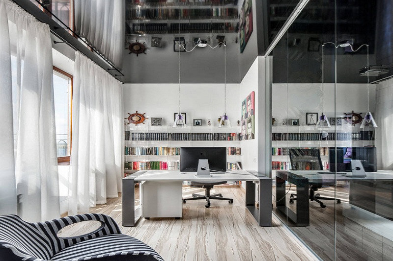 • черный матовый натяжной потолок поглощает свет, смотрится очень необычно, подходит интерьерам в стиле лофт;