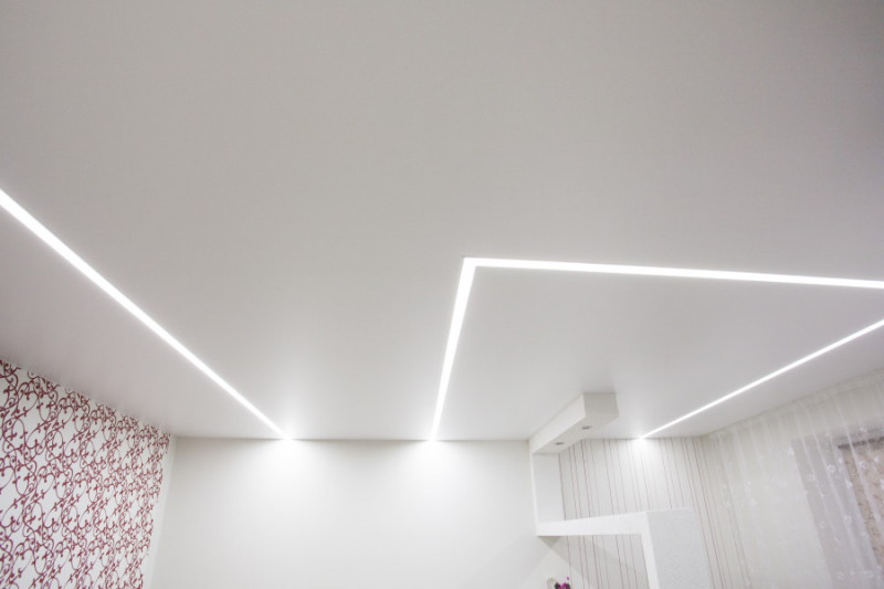 Оптимальным считается бесщелевой профиль или теневой. Это минималистичная конструкция красиво сочетается с линиями света на потолке.