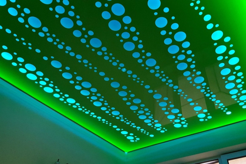 Одинаково хорошо сочетается с точечными светильниками, люстрами, световыми линиями, парящими потолками.