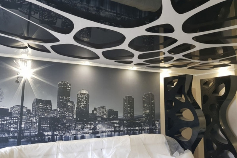 Одинаково хорошо сочетается как с тканевым натяжным потолком, так и с пленочным. В последнем случае подойдут более плотные премиальные полотна.
