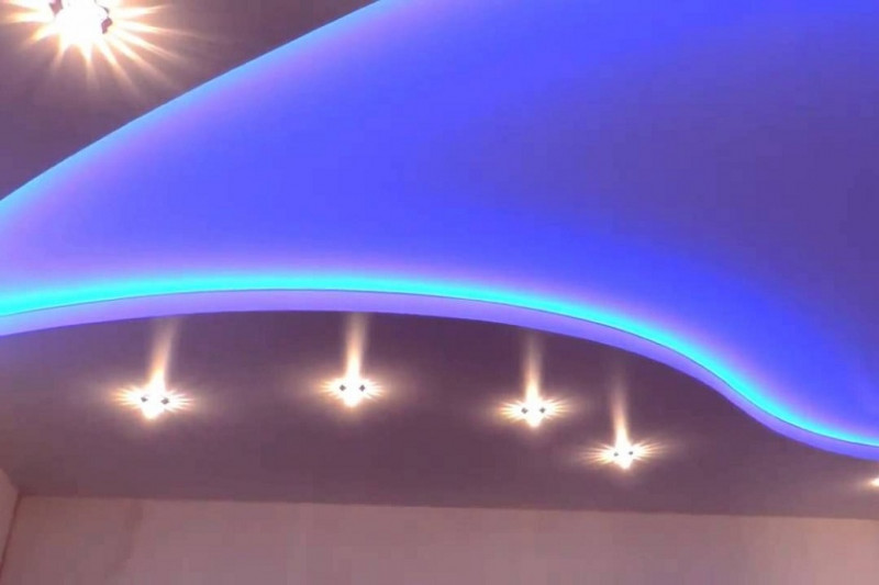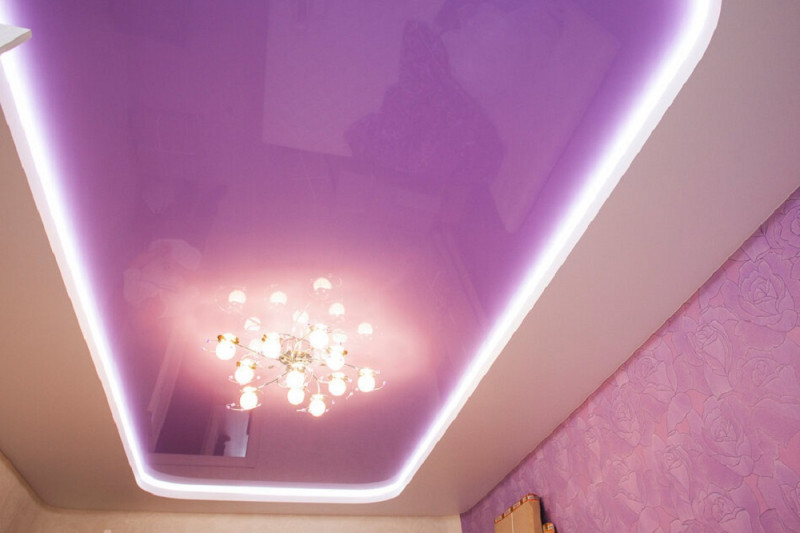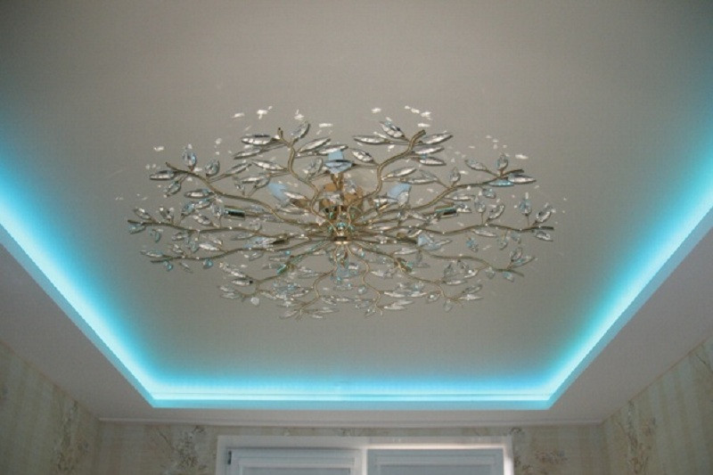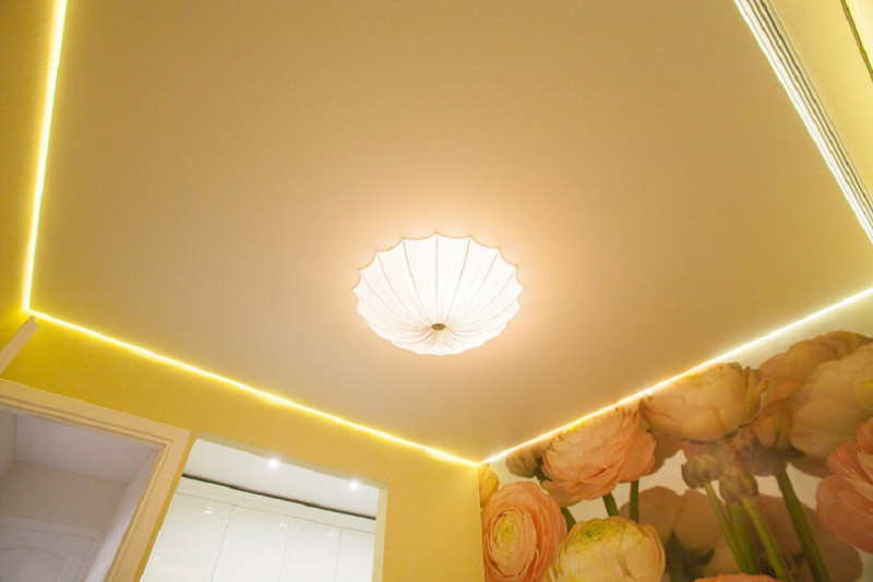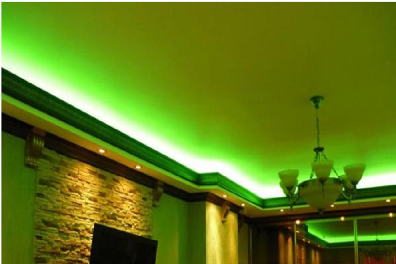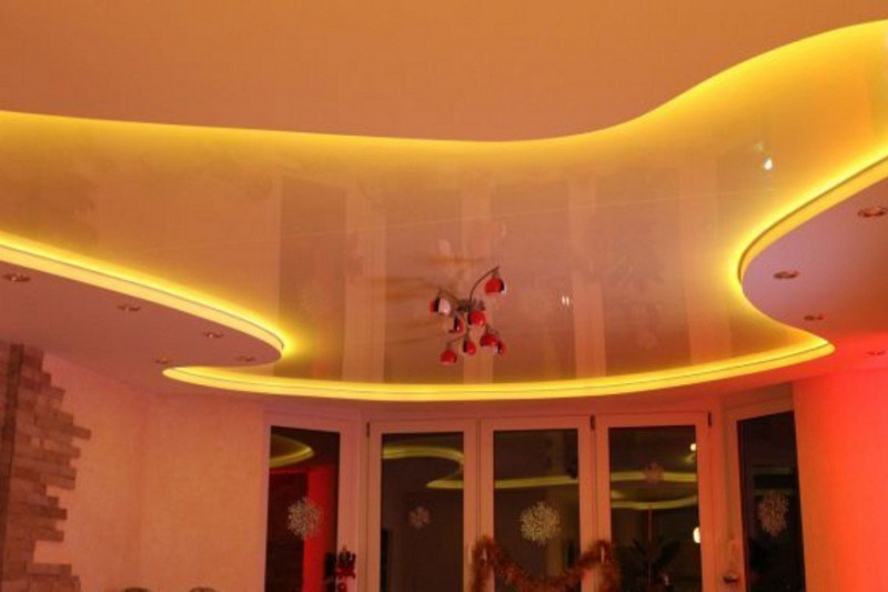 В специальный профиль по периметру комнаты закладывается светодиодная лента, закрываемая сверху поликарбонатным рассеивателем. Такое освещение дополняет стандартное верхнее и создает атмосферу.