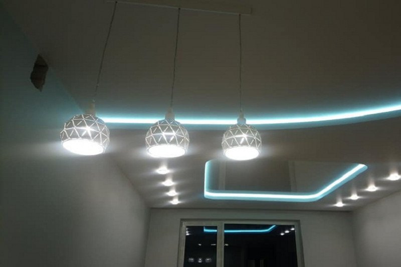 Во втором вы получаете декоративную подсветку. Это могут быть споты на шинопроводе, парящие потолки, скрытое освещение встроенного карниза. Такие светильники обычно дополняют функциональный свет, расставляя акценты – смотрите фото объектов в Люберцах.
