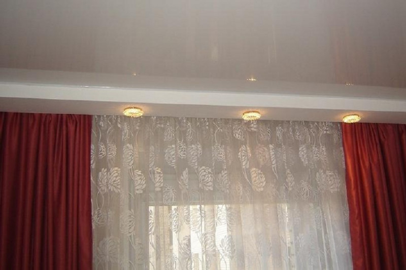 Карниз монтируется на одном уровне с натяжным полотном. В готовом виде это даст эффект парящих штор, смотрится более легко, изящно. Подходит, если вы планируете тонкие полупрозрачные занавески.