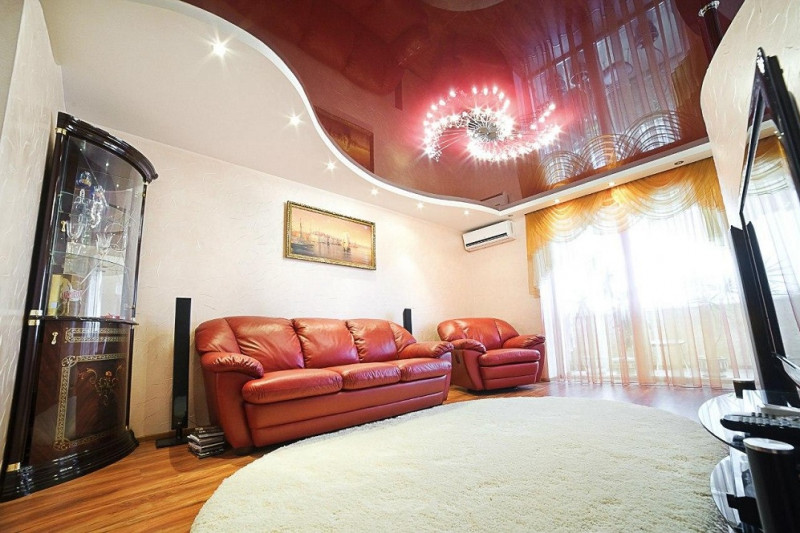 Одинаково хорошо сочетается как с тканевым натяжным потолком, так и с пленочным. В последнем случае подойдут более плотные премиальные полотна.