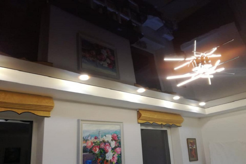 Натяжной потолок в зале из ПВХ не пострадает. Напротив, он убережет обстановку и ремонт от намокания и порчи. Пленка выдерживает до 100л воды на м2.