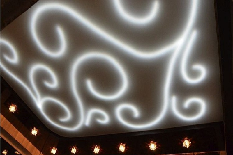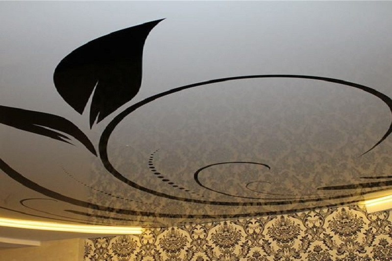 Одинаково хорошо сочетается как с тканевым натяжным потолком, так и с пленочным. В последнем случае подойдут более плотные премиальные полотна.
