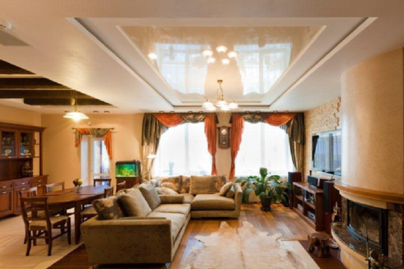 Натяжной потолок в зале из ПВХ не пострадает. Напротив, он убережет обстановку и ремонт от намокания и порчи. Пленка выдерживает до 100л воды на м2.
