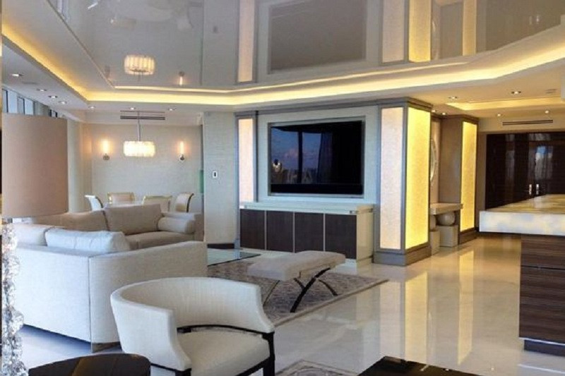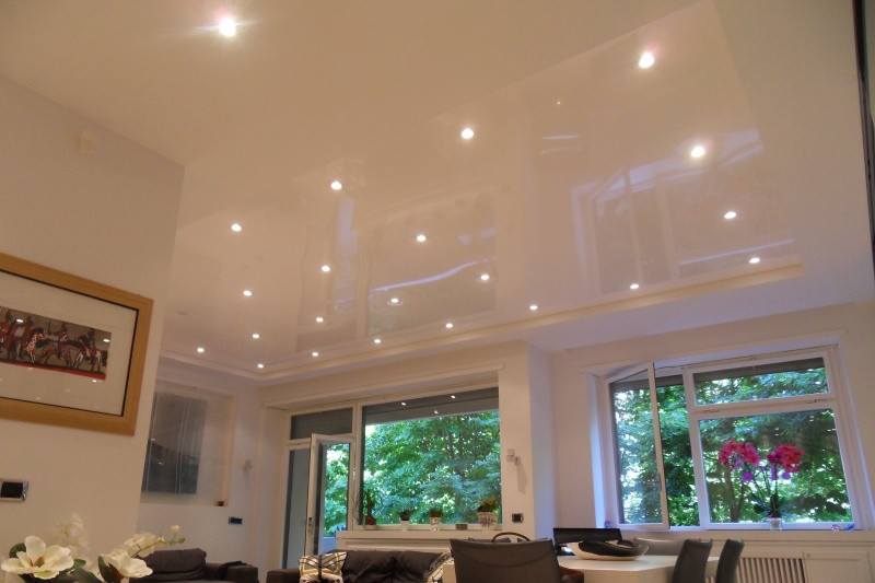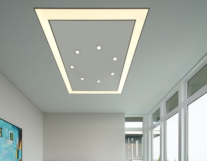 Одинаково хорошо сочетается с точечными светильниками, люстрами, световыми линиями, парящими потолками.