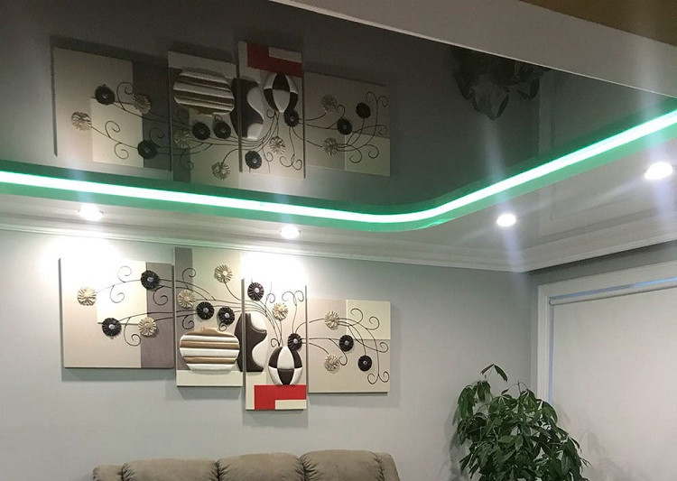 Одинаково хорошо сочетается как с тканевым натяжным потолком, так и с пленочным. В последнем случае подойдут более плотные премиальные полотна.