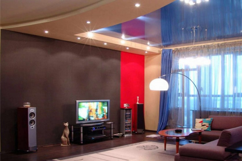 Натяжной потолок в зале из ПВХ не пострадает. Напротив, он убережет обстановку и ремонт от намокания и порчи. Пленка выдерживает до 100л воды на м2.