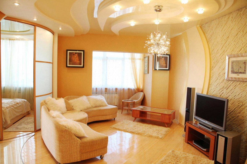 В зал очень хорошо делать встраиваемые системы света. Продуманный сценарий освещения, возможность менять его просто щелкая выключателями – все это не только красивая подсветка, но функционал.