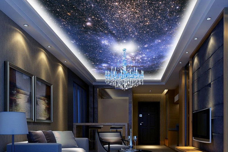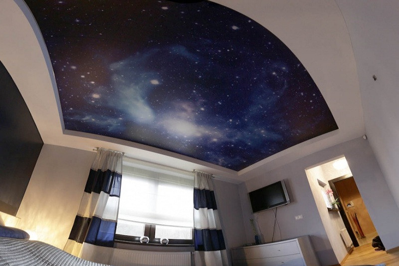 Самый доступный вариант натяжного потолка «Звездное небо», сделанный с помощью фотопечати. Освещение может быть стандартным: люстра, точечные светильники или парящий профиль.