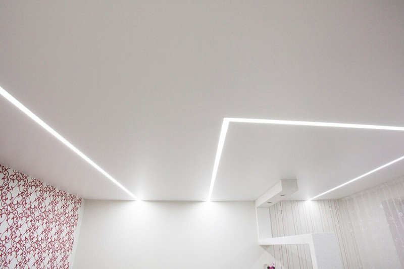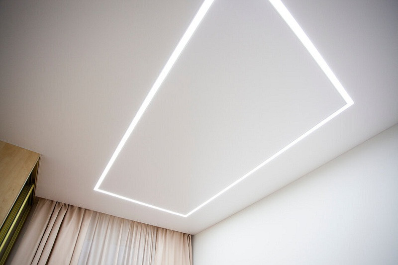 Оптимальным считается бесщелевой профиль или теневой. Это минималистичная конструкция красиво сочетается с линиями света на потолке.