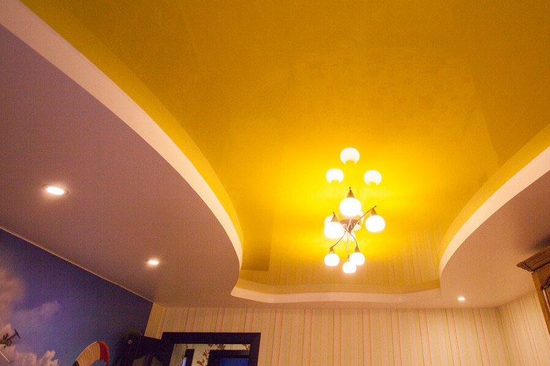 Одинаково хорошо сочетается как с тканевым натяжным потолком, так и с пленочным. В последнем случае подойдут более плотные премиальные полотна.
