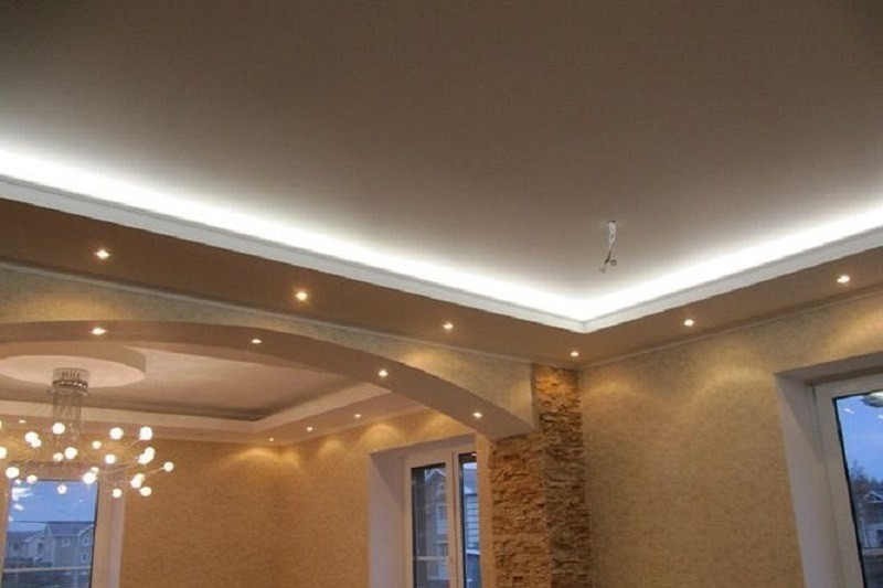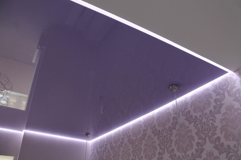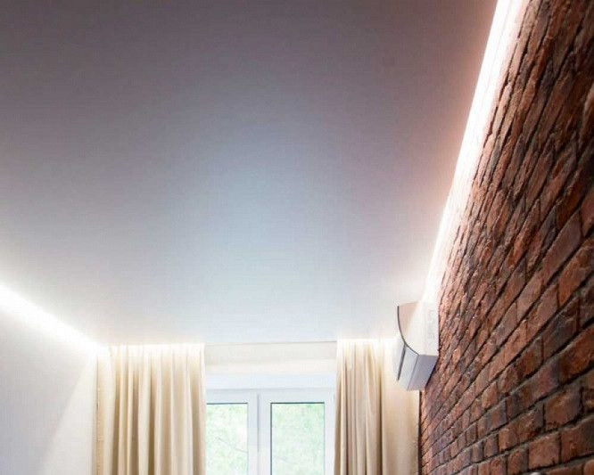 Принцип их монтажа такой же, как у теневых, но с большей шириной профиля (примерно 2 – 2,5 см). Внутрь закладывается светодиодная лента. Располагается она внутри таким образом, чтобы не быть видимой при взгляде вверх с пола.