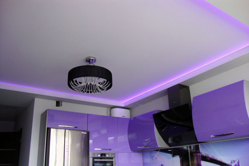 Если квартира представляет собой студию или объединены кухня и гостиная, то за счет двухуровневой конструкции, одна часть которой выполнена с использованием парящего профиля, отделить зоны проще всего.