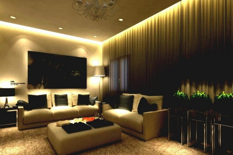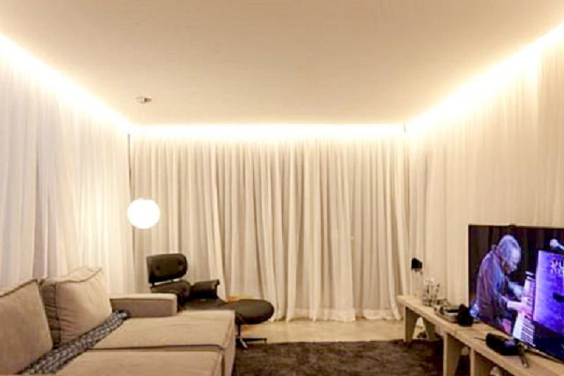 За счет светящейся полоски между потолком и стеной кажется, что потолочная поверхность парит в воздухе. Зрительно это поднимает стены на большую высоту, чем они есть.