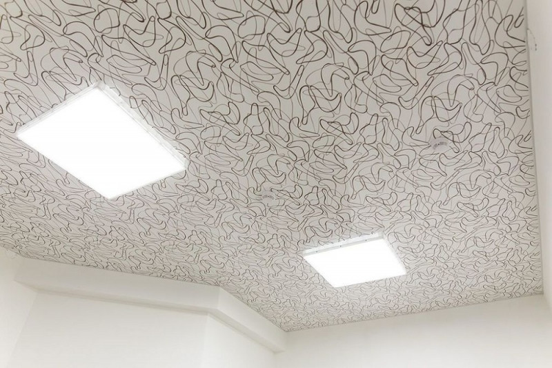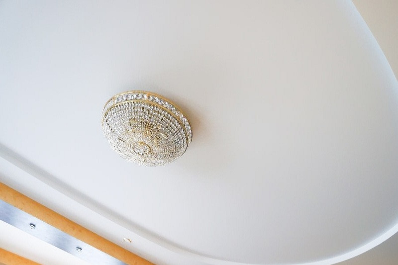 Одинаково хорошо сочетается как с тканевым натяжным потолком, так и с пленочным. В последнем случае подойдут более плотные премиальные полотна.